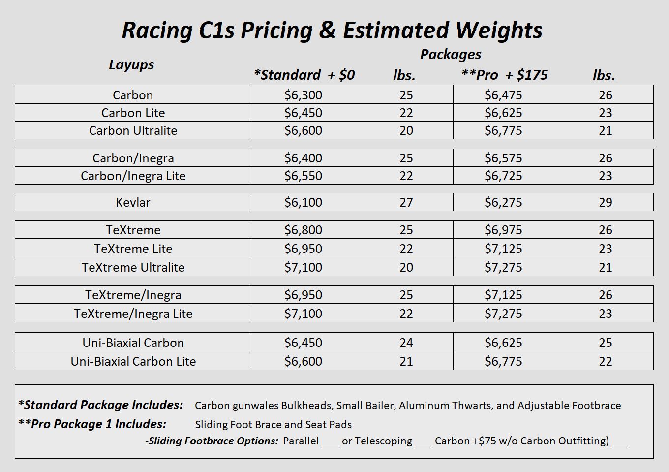 The Diller designs are time tested and raced by the best, and keep finishing ahead of the rest. They have been evolving for the past 35 years into the fastest, best handling C-1 marathon racing canoes available today, dominating most C-1 races. With twelve hull options, we have a canoe to fit every paddler's weight and paddling style. They are the same basic design concepts with a a little changes and different volumes to displace the correct amount of weight for the size of the paddler. Not only are Savage River C-1s among the fastest designs they also are more stable and are better handling then other C-1s.