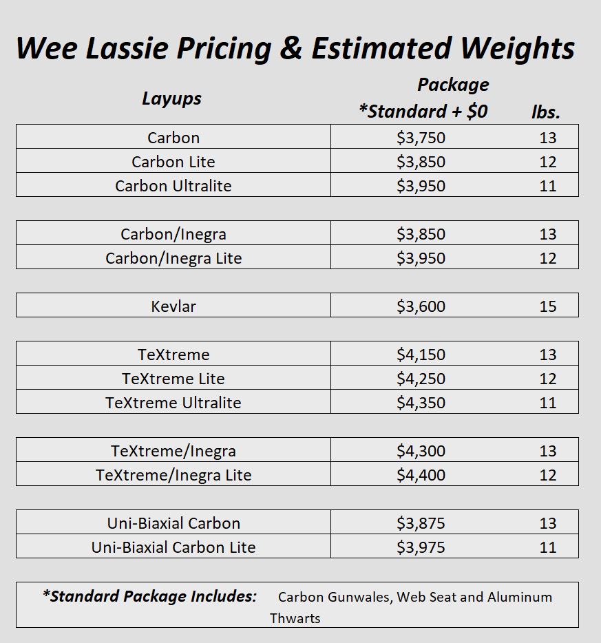 Quiet, serene, solo paddling in those hard to get to places is where the Wee Lassie excels. This canoe is a modified version of an old Henry Rushton design, which is configured with a low seat and paddled with a double bladed paddle. It also can be paddled in the kneeling position as a free style canoe. The short length and narrow slight V-bottom hull makes this an ideal canoe for shallow, twisty streams and rivers. Flared sides give it good final stability and make it very seaworthy on larger bodies of water with wind and waves. With our light lay-ups, this boat is probably the lightest canoe made and makes it a joy to portage and paddle. If you enjoy exploring places where most canoes cannot go, try the Wee Lassie.